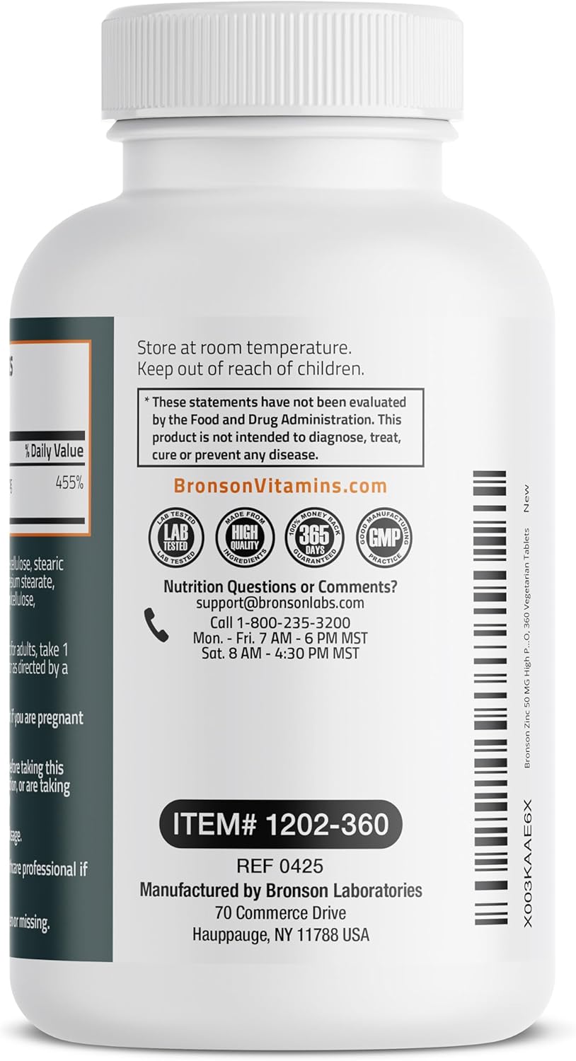 High Quality & Great Value: Bronson Basics Zinc provides a potent 50 MG of Zinc per vegetarian tablet in a 1 year supply bottle. We strive to support your good health and well-being through high quality supplements at the best value.