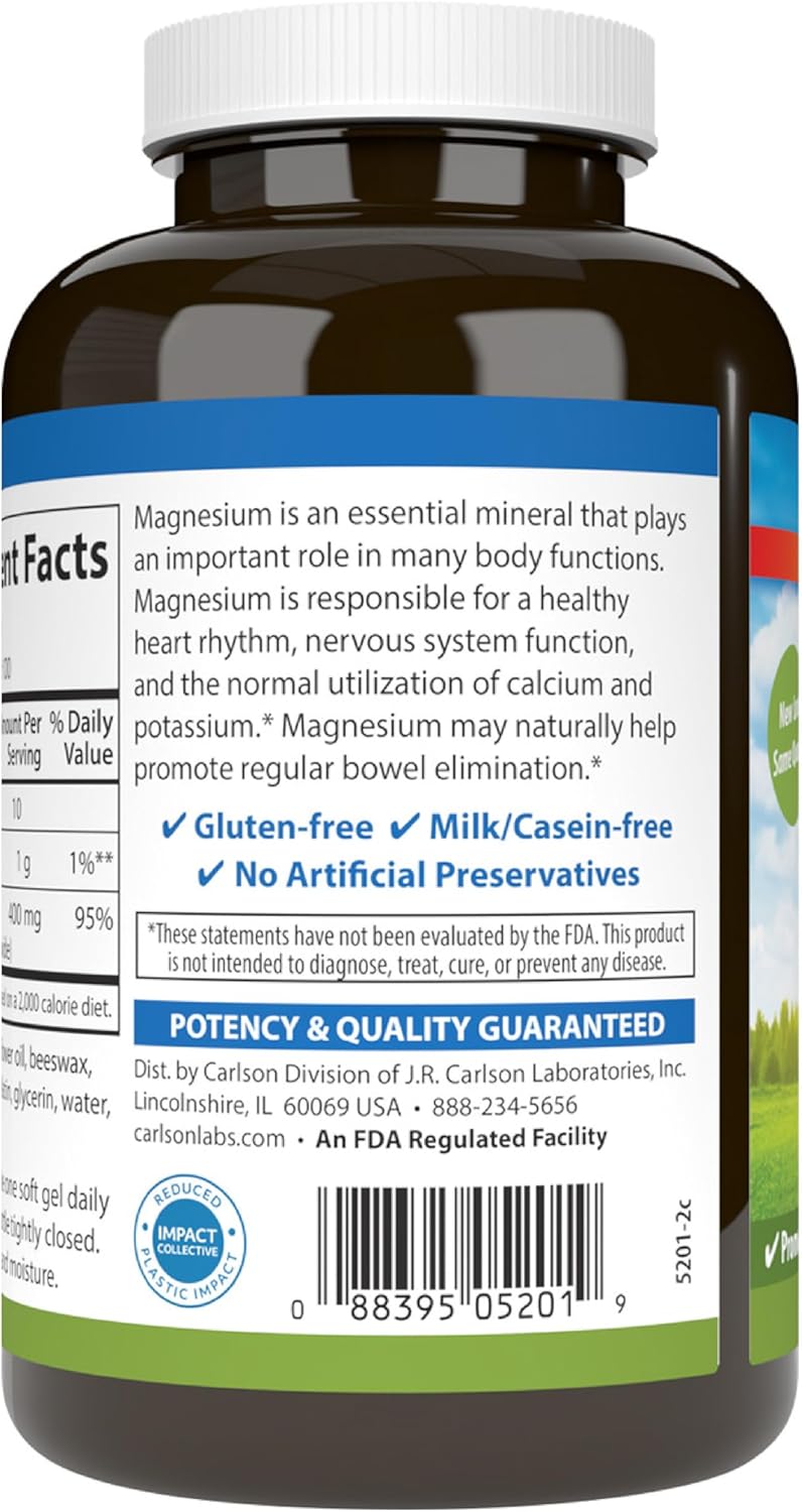 8 reviews for Carlson – Magnesium Gels, 400 mg of Magnesium per Softgel, Heart & Muscle Support, Magnesium Gel Caps, Bowel Function, Magnesium Supplement, 250 Softgels
