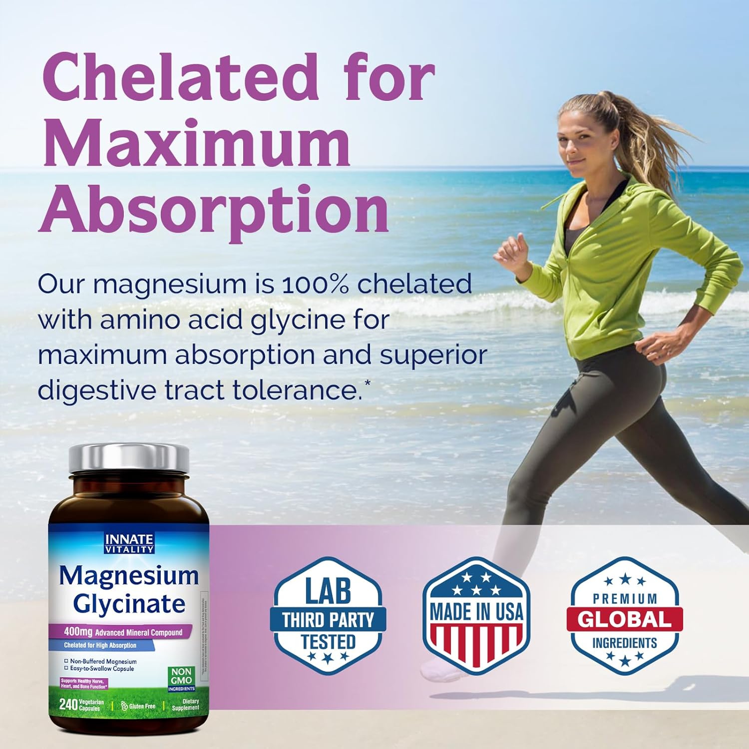 [Use Only 100% Chelated and Non-Buffered Magnesium Glycinate] Innate Vitality Magnesium Glycinate 400mg capsules are soy-free, gluten-free, dairy-free, Non-GMO & vegetarian friendly, with no corn, no eggs, no wheat, no tree nuts, no peanuts, no fish, no shellfish, no artificial colors, flavors, binders or fillers.