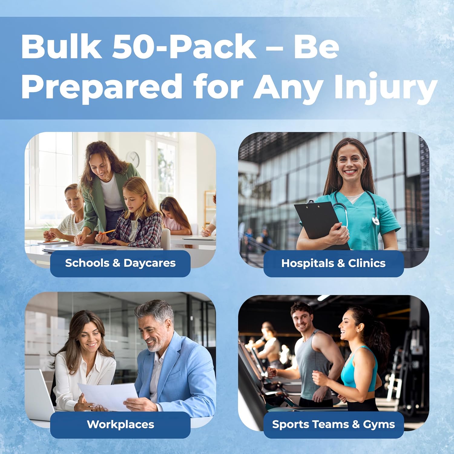 50 pack – each order is for 50 5″ X 6″ Cold packs. It’s an ideal way to supply yourself with a large quantity of cold packs. Great for schools, camps, gyms, offices, homes – or anywhere where physical activity could lead to minor injury and pain. This is a great way to supply yourself with a reliable stock of cold packs.