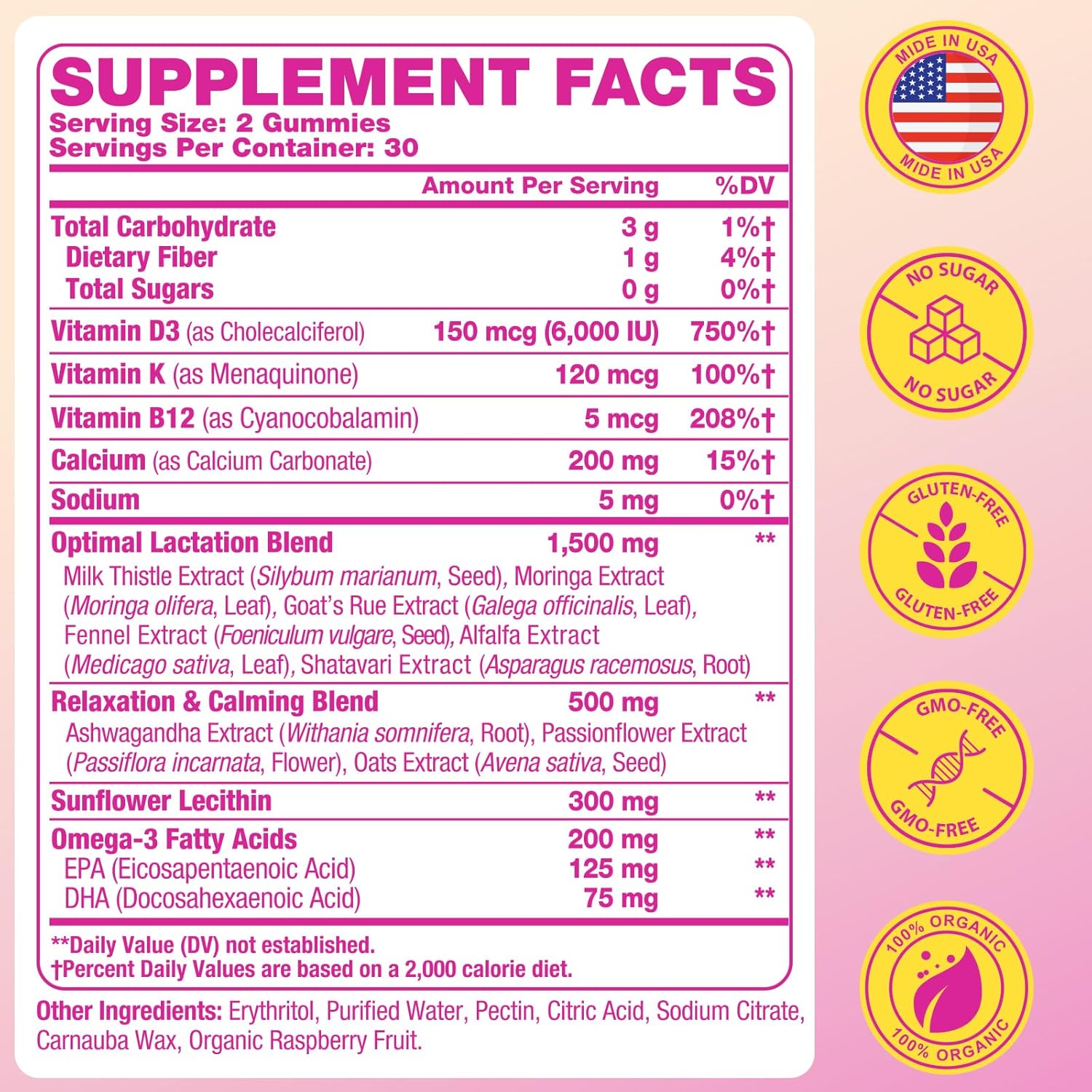 Sugar-Free, Vegan & Convenient: Our lactation gummies are raspberry flavored, sweetened with erythritol, sugar-free, vegan and gluten-free. Each bottle has 60 delicious gummies in a 30-day supply to support lactation and postpartum wellness in an easy and enjoyable way—perfect for busy, on-the-go moms