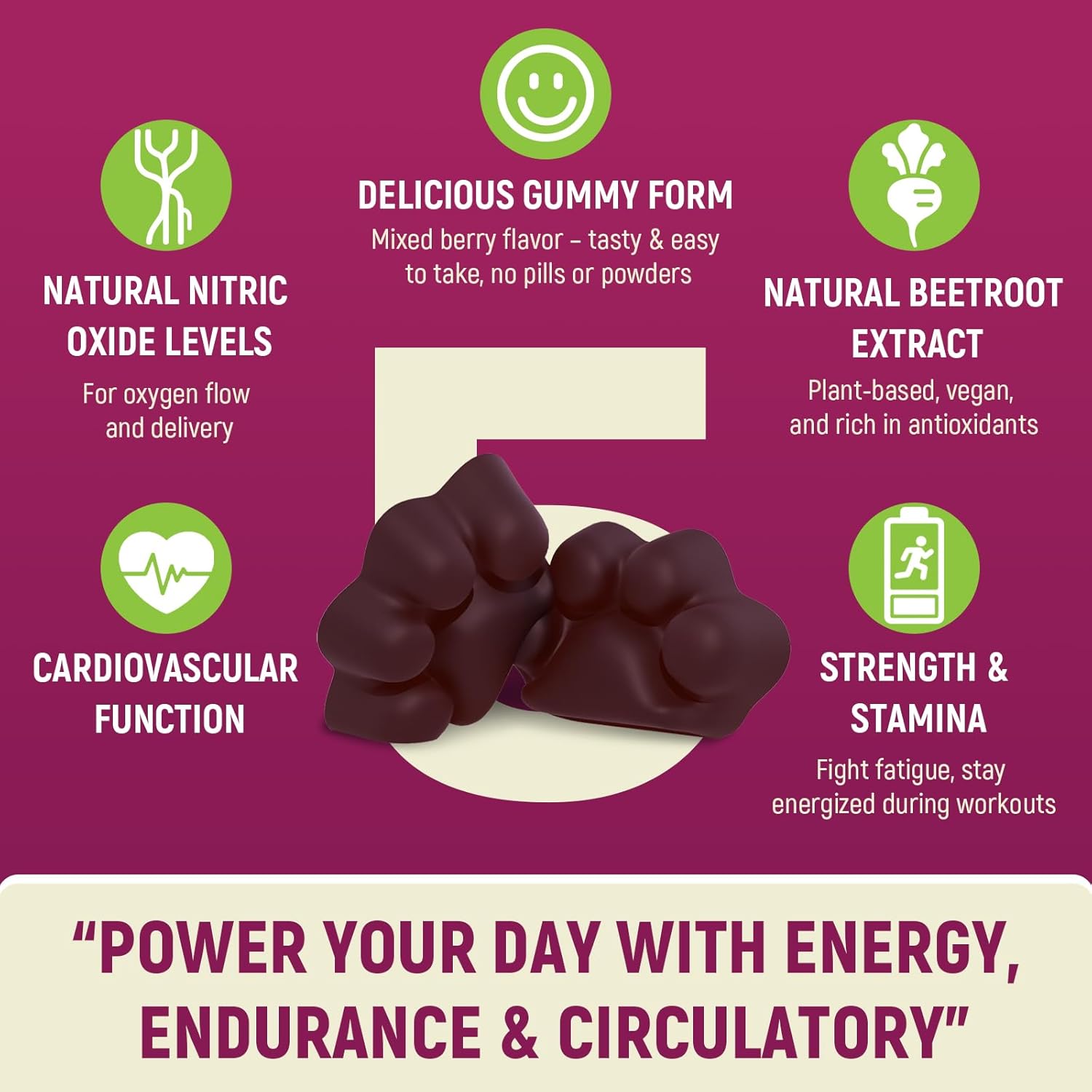 Mixed Berry Flavor: Sugar-free nitric oxide gummies with a refreshing blend of berries and pomegranate — a tasty way to enjoy beetroot daily