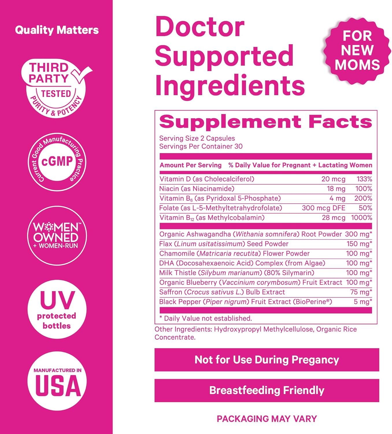 Postnatal Vitamins and Nutrients: Our postpartum recovery supplements feature ingredients new moms need! Your body needs Vitamin D to encourage serotonin and dopamine production for hormonal balance and immune health. B-complex vitamins support brain chemicals that affect mood regulation and cognition. DHA and flaxseed provide omega-3 fatty acids for melatonin production to support your return to healthy sleep habits.