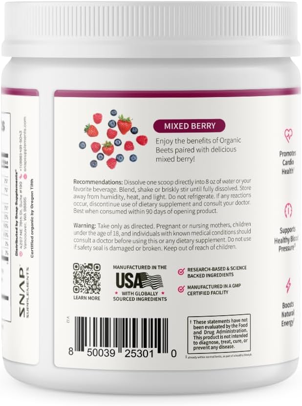 13 reviews for Snap Supplements Organic Beet Root Nitric Oxide Powder – Supports Energy and Healthy Circulation, 8.8 oz (30 Servings, 1 Month Supply), Mixed Berry