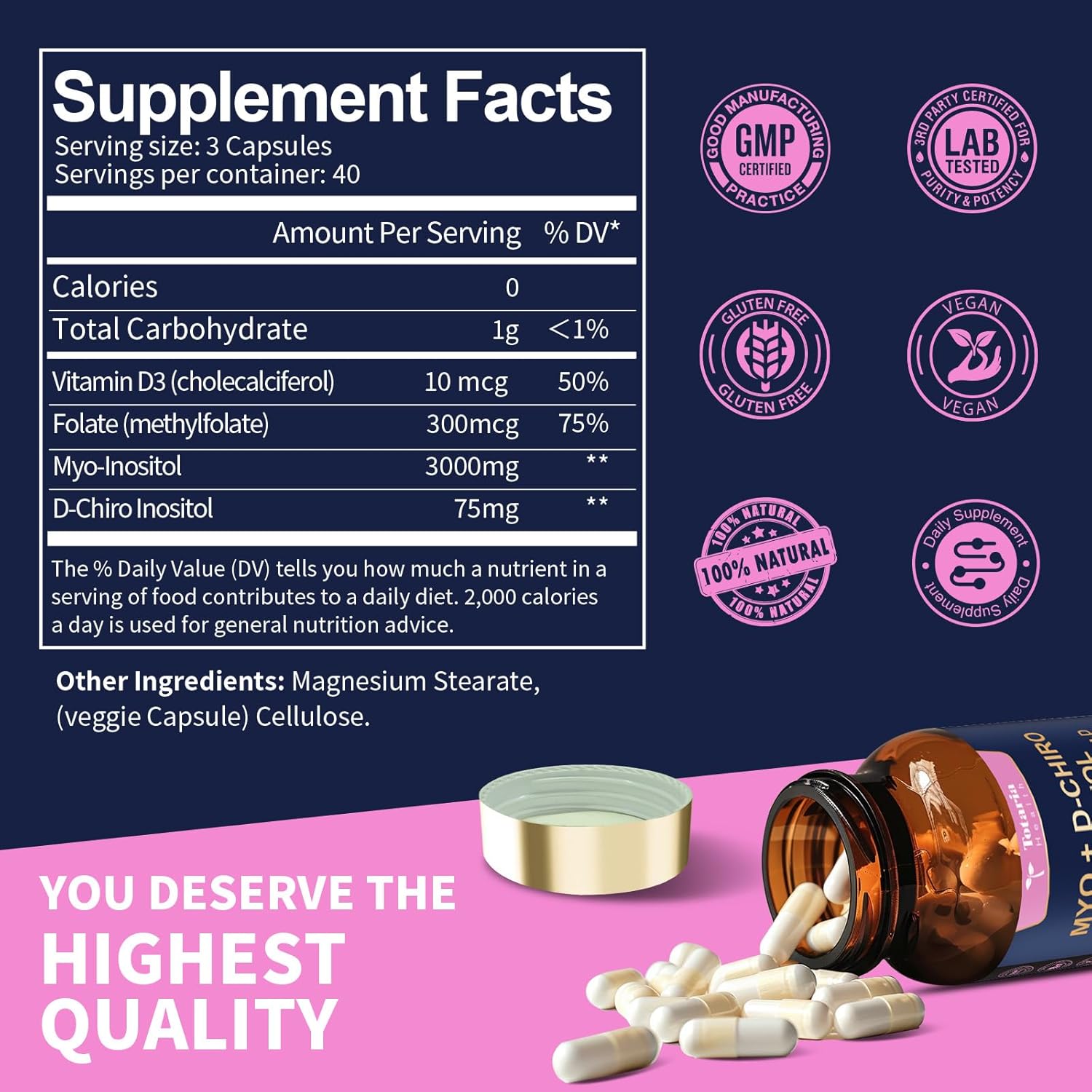 Easy to Swallow, No Aftertaste: This 40-day supply every bottle (3 capsules per day recommended) is designed for women’s well-being, supporting hair, skin, energy, and mood with natural Myo-Inositol & D-Chiro Inositol capsules.