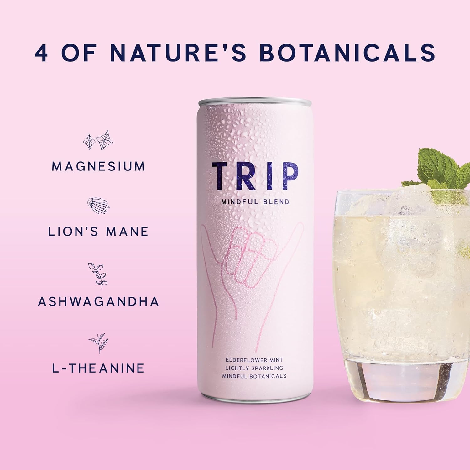8 reviews for Trip Mindful Blend, Lightly Sparkling Adaptogen Seltzer, Mocktail w/ 120mg Magnesium Citrate with Ashwagandha, Lions Mane & L Theanine, No Added Sugar, Vegan, Elderflower Mint, 12 Oz, 12Pk