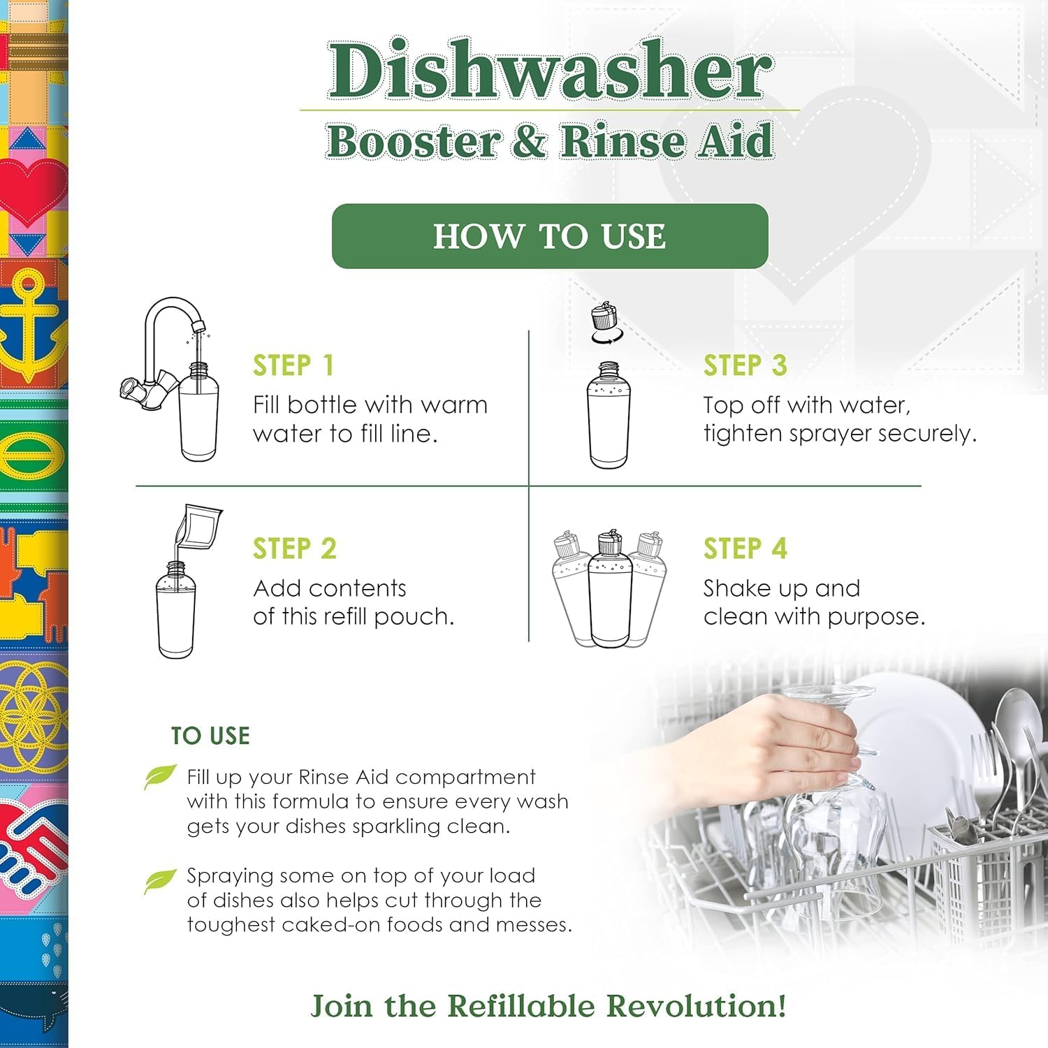 SAFE FOR THE ENVIRONMENT: Our dishwasher booster and rinse aid features a safe formula, crafted from natural ingredients that are gentle on the environment and your household. By choosing our product, you’re also making a sustainable choice that helps reduce the impact of single-use plastic bottles on landfills.