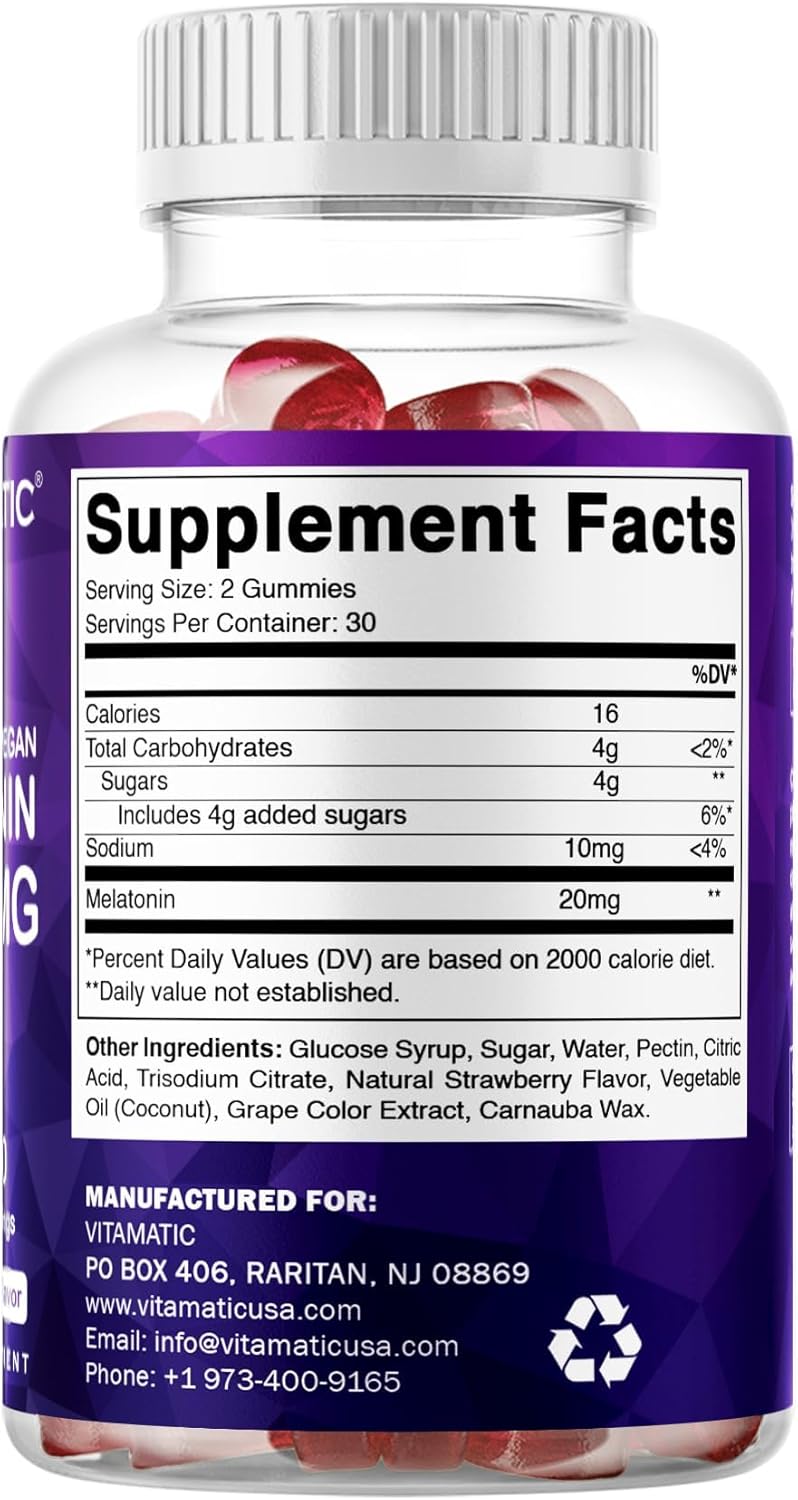 So, I’ve been having a rough time falling asleep lately – you know, mind racing, tossing and turning, the usual fun. Decided to give these Vitamatic Melatonin 20mg gummies a try. My buddy recommended them.First off, they taste pretty good! Way better than swallowing a pill, that’s for sure. It’s like a little berry treat before bed. I take two as the bottle says.And the good news? They actually seem to work! Most nights, I find myself drifting off easier than before. I’m not waking up as much in the middle of the night either, which is a huge plus. I usually feel pretty refreshed in the morning, not super groggy like some other things I’ve tried.Now, 20mg seems like a lot, and I did wonder if it was too much. Some nights if I take them and then stay up on my phone, I don’t feel like they hit me as hard. And one or two times, I still had a bit of a restless night, so it’s not like a magic knockout punch every single time. But overall, it’s definitely an improvement.They’re also vegan, which is cool, though not something I was specifically looking for.If you’re struggling to get some decent shut-eye and other stuff hasn’t worked, I’d say these are worth a shot. They taste good and, for me at least, they help me get to sleep and stay asleep most of the time. Just be aware that 20mg is a pretty strong dose.