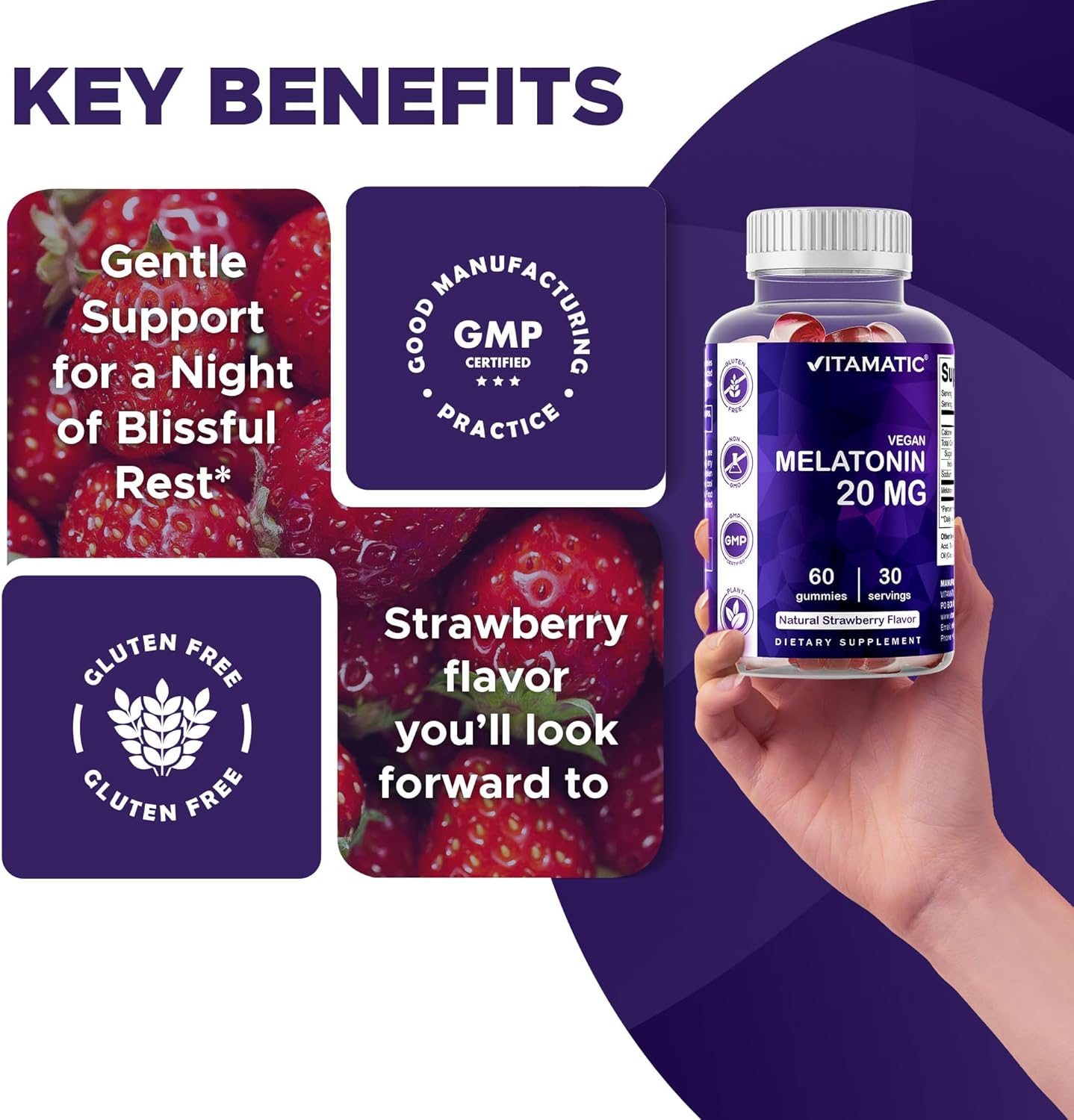 DELICIOUS NATURAL BLACKBERRY TASTE of Vitamatic Melatonin Gummies – Avoid consuming Large Melatonin Capsules, Tablets or Pills which gives unpleasant after taste & can not go down easily