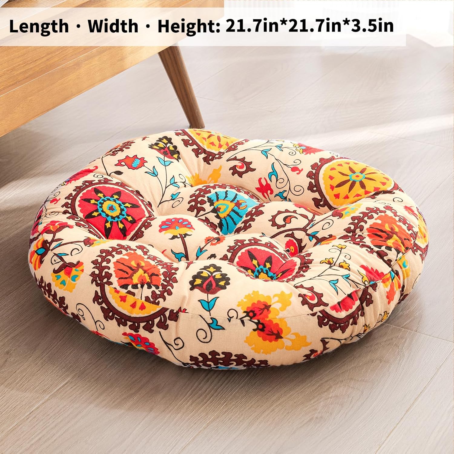 The cushion is decent, but not quite what I expected. The filling isn’t as thick or plush as it looks in the pictures—it’s a bit thinner and flattens out more easily. Also, the colors aren’t as vibrant in person; they’re a bit more muted than I hoped for. That said, it’s still soft and comfortable enough to sit on, especially for meditation or casual seating on the floor. I’d probably give it about 3.5 out of 5 stars. It’s okay for the price, but just be aware it’s not as full or bright as it appears online.